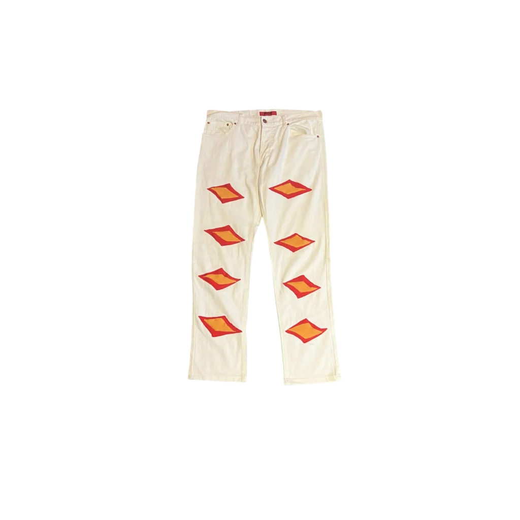 These off-white jeans are inspired by the expressive world of Jean-Michel Basquiat — where symbols replace words, and every shape carries emotion.