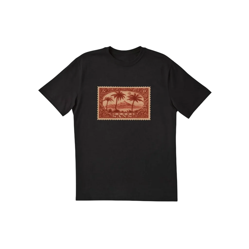 The “Palm Stamp” design captures a vintage island scene framed like a postage stamp — a reminder that every journey leaves its mark. Printed in warm sepia tones on premium upcycled cotton, this piece feels like a postcard from another world.